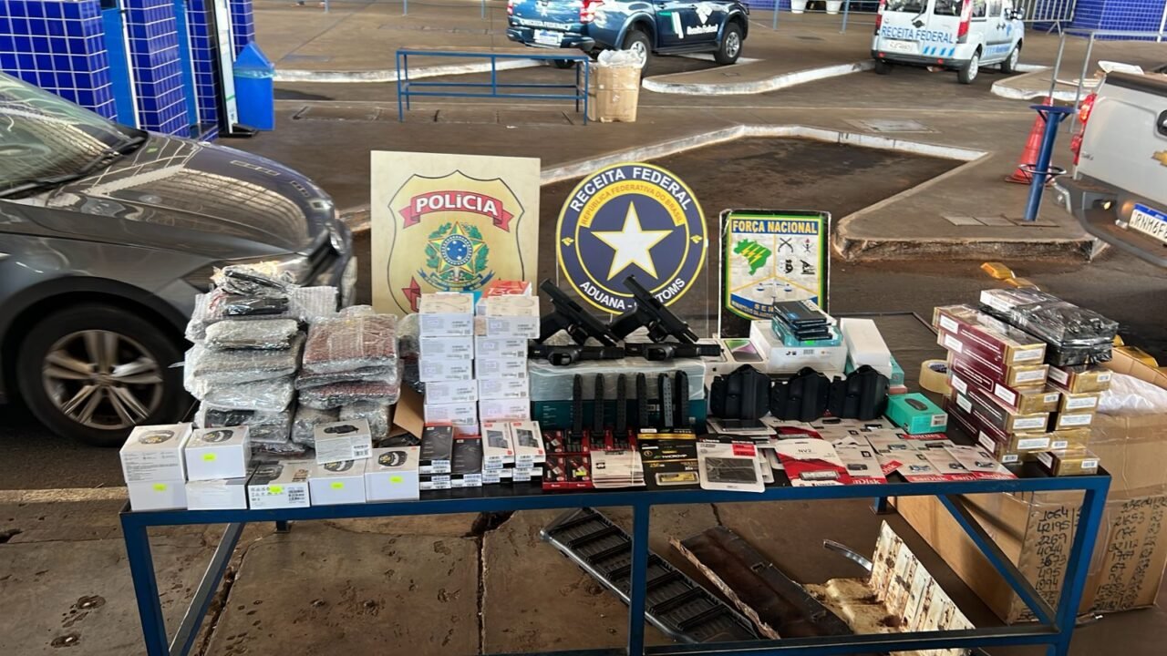As armas estavam escondidas em fundo falso em meio a uma grande quantidade de mercadorias diversas como celulares e eletrônicos de um veículo, com placas do Paraguai, abordado para fiscalização, conduzido por uma cidadão de origem paraguaia.