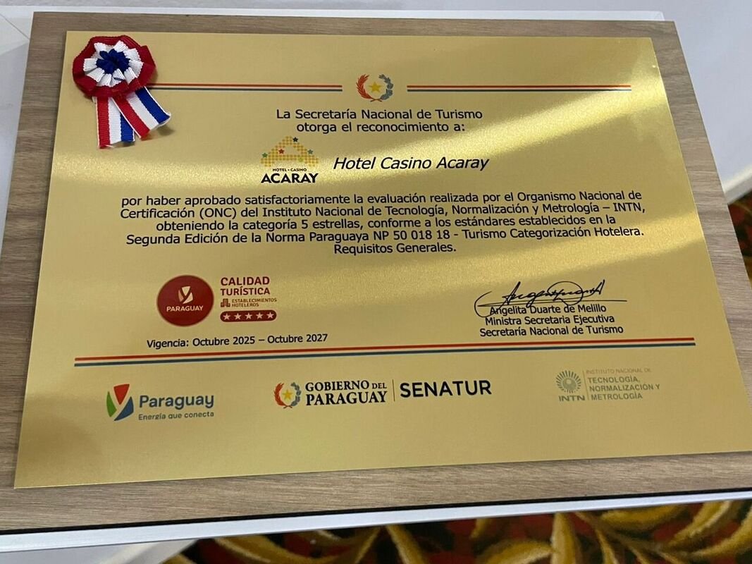O Hotel Casino Acaray, um dos principais destinos de hospedagem no Paraguai, celebra a conquista da distinção de 5 estrelas pela Secretaria Nacional de Turismo do Paraguai (Senatur), recebendo o reconhecimento pelo segundo ano consecutivo. A entrega da placa de certificação foi feita pela A ministra do Turismo do Paraguai, Angelita Duarte, que em discurso reforçou o compromisso do hotel com padrões elevados de qualidade e serviço, seguindo a Norma Paraguaia de Turismo PNA 5001818 da Categorização Hoteleira, parte do Sistema Nacional de Qualidade Turística.