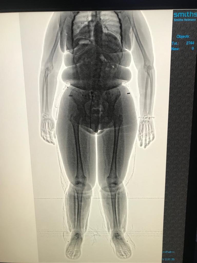 Os policiais federais, após fiscalização de rotina, identificaram a droga presa no corpo da passageira através do Body Scan.