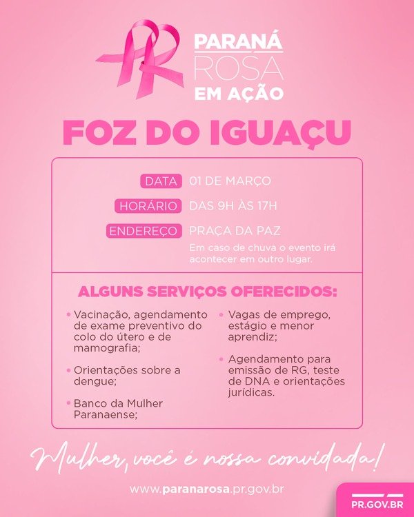 O Paraná Rosa em Ação oferta mais de 40 serviços públicos às mulheres nesta sexta-feira (01), das 9h às 17h, na Praça da Paz. A programação organizada pelo Governo do...