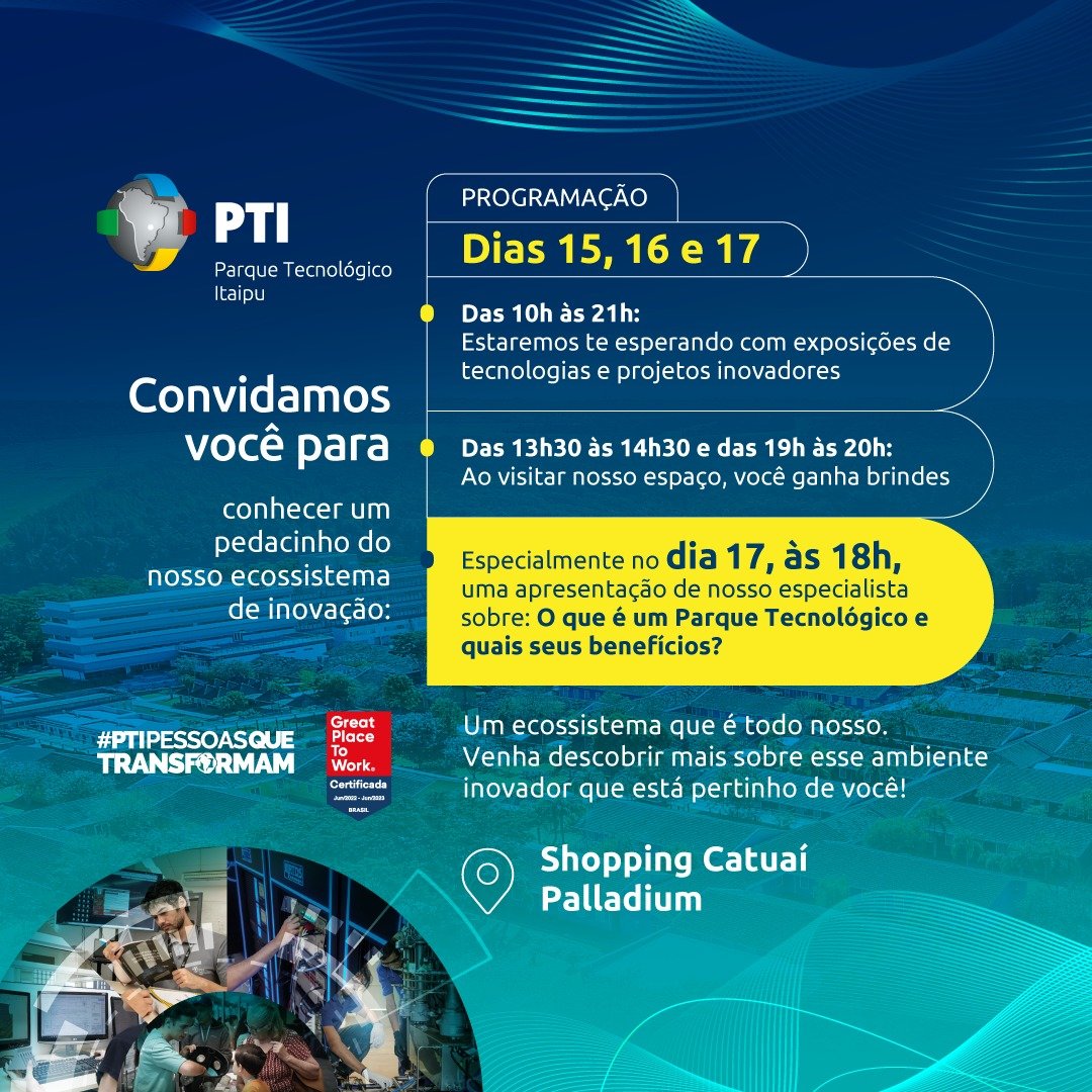 Nos dias 15, 16 e 17 de dezembro, o Parque Tecnológico Itaipu-Brasil (PTI-BR) realizará uma exposição e bate-papo sobre inovação e tecnologia no Shopping Catuaí Palladium em Foz do Iguaçu. A...