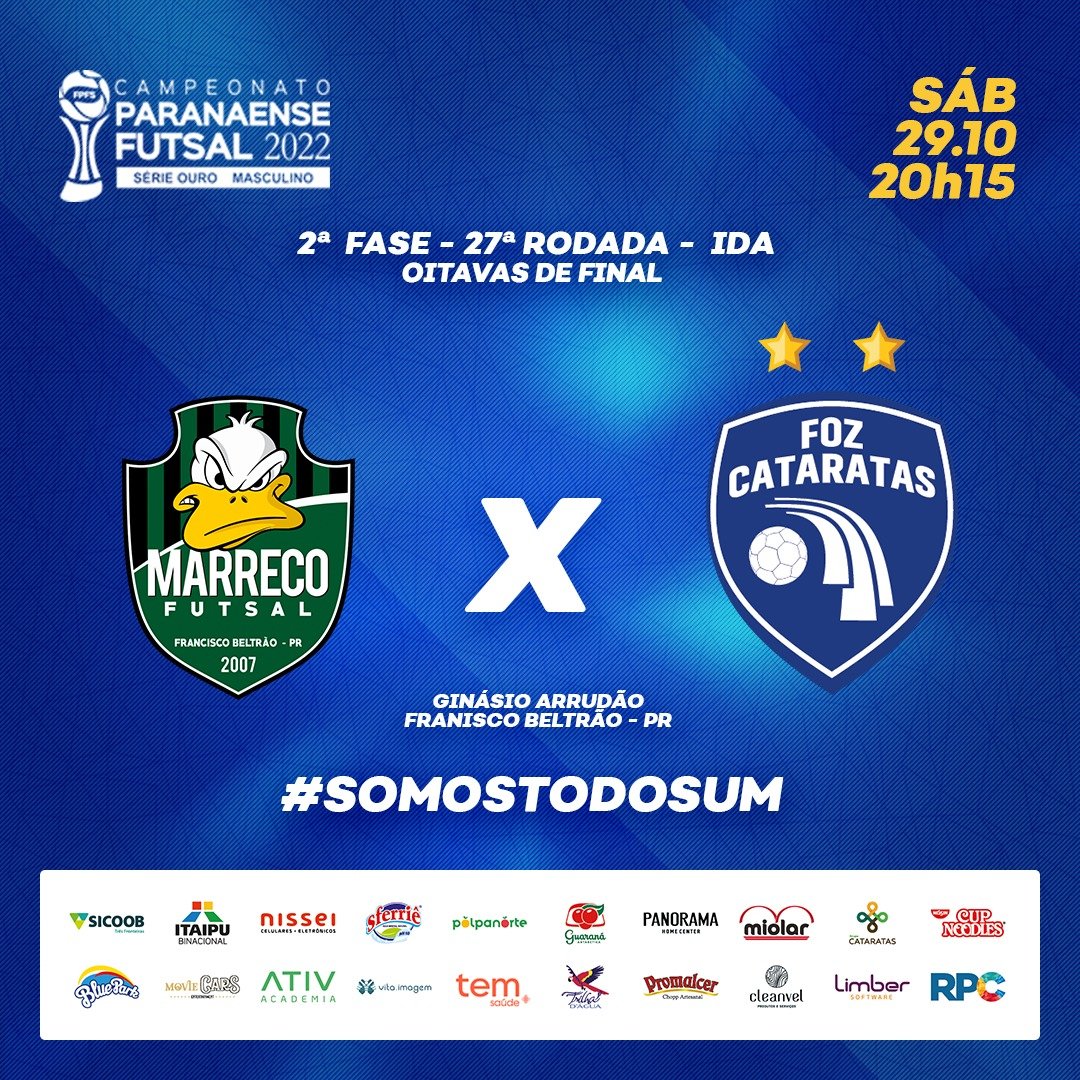 O Foz Cataratas Poker Futsal encara o Marreco, no primeiro confronto das oitavas de final do paranaense, neste sábado, 29 de outubro, às 20h15, no ginásio Arrudão em Francisco Beltrão....