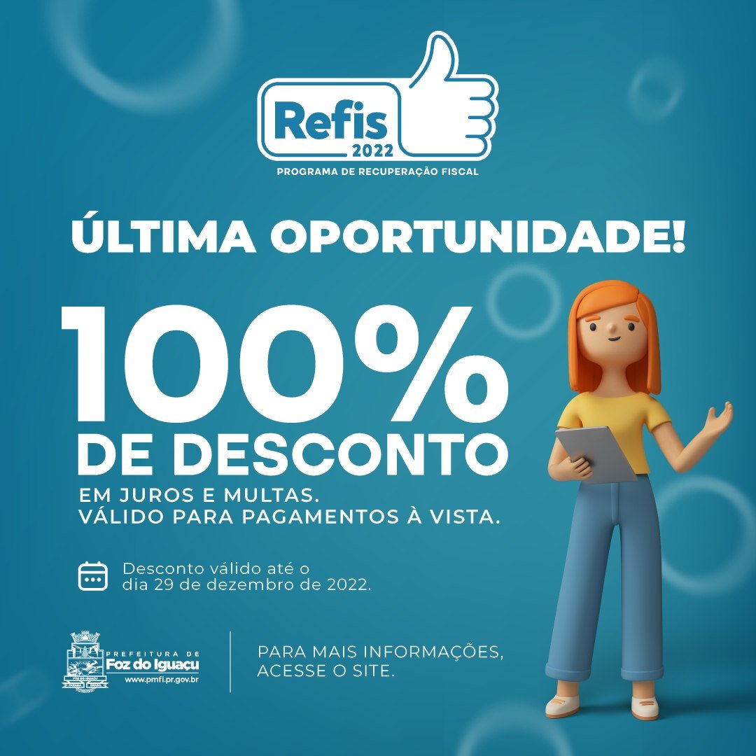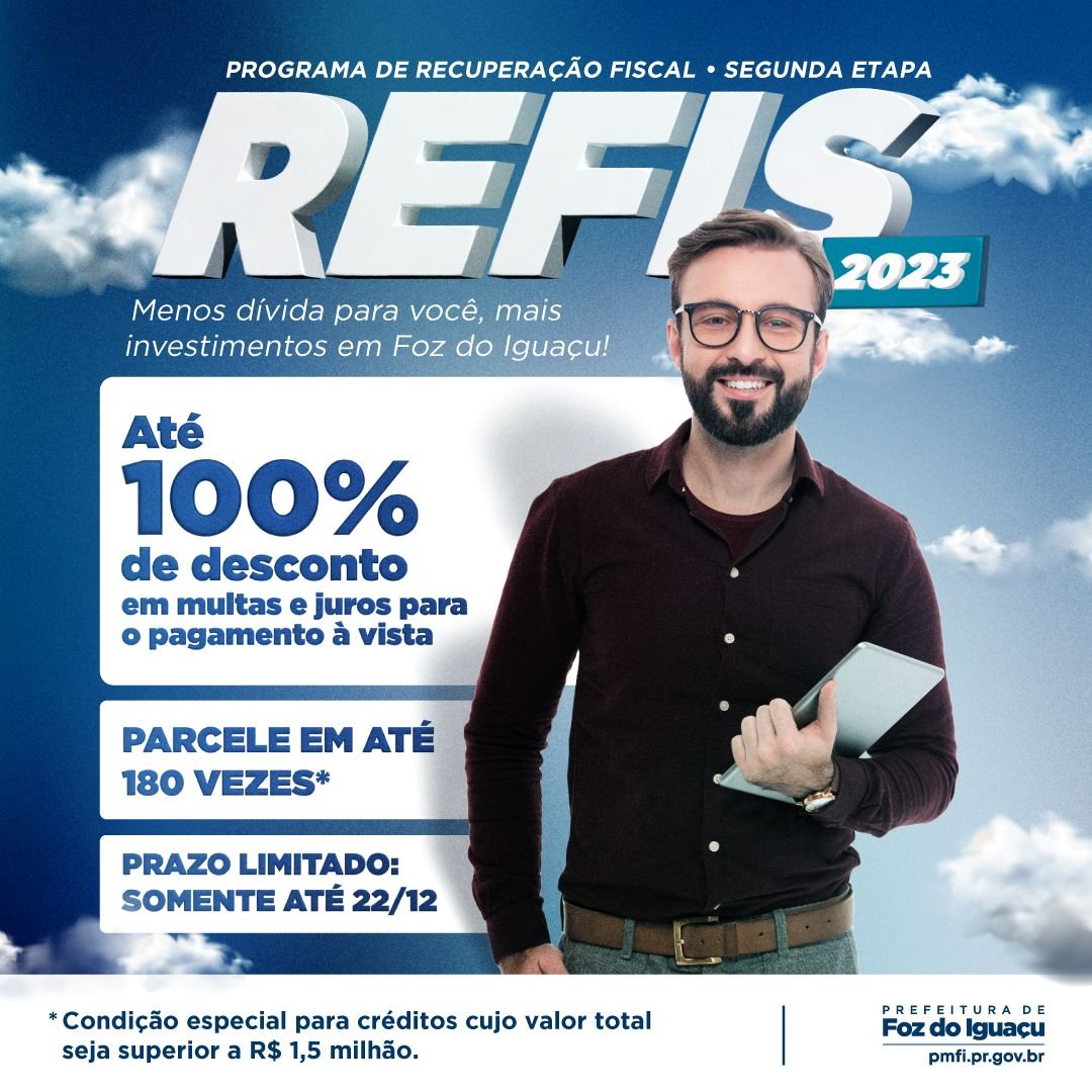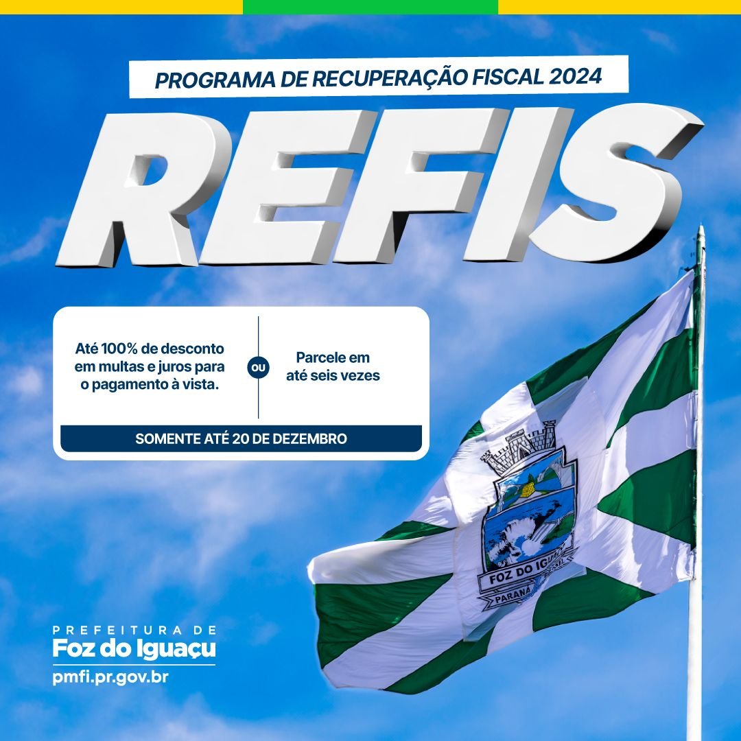 A prefeitura de Foz do Iguaçu informa que está disponível o Programa de Recuperação Fiscal de Foz do Iguaçu – Refis 2024, com descontos de até 100% nos juros e...